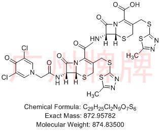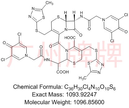 CAS No:N/A||Chemical Formula:C35H30Cl4N10O8S6||Molecular Weight:1052.84700||Exact Mass:1049.93264||3-((6R,7R)-7-(2-(3,5-dichloro-4-oxopyridin-1(4H)-yl)acetamido……
