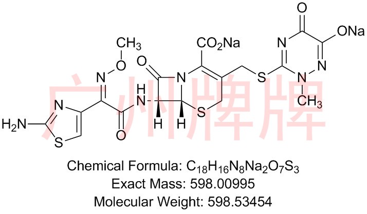 CAS No:104376-79-6 (hydrated form)||Chemical Formula:C18H16N8Na2O7S3||Molecular Weight:598.53454||Exact Mass:598.00995 ||sodium (6R,7R)-7-((Z)-2-(2-aminothiazol……