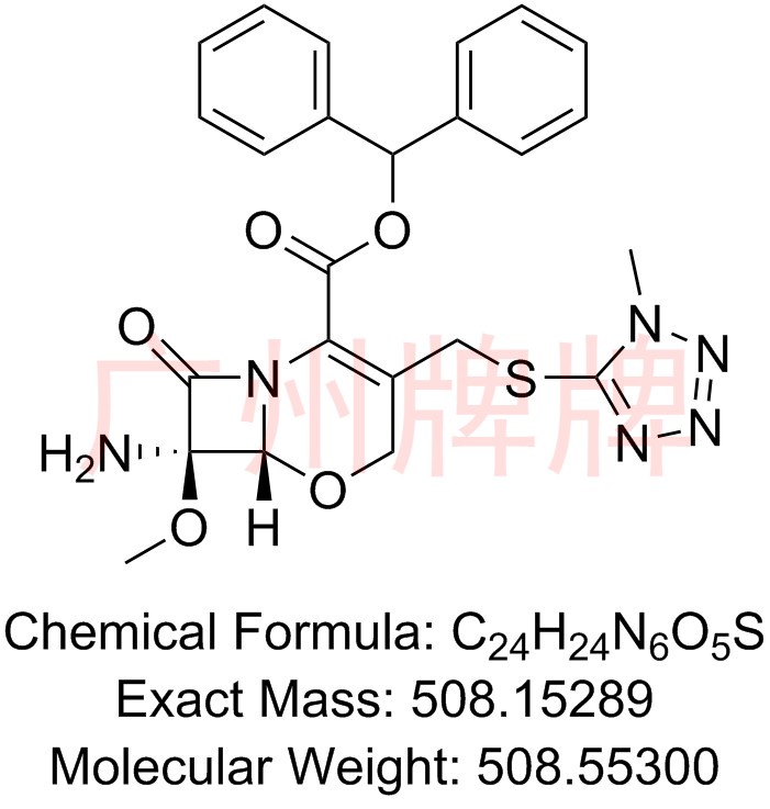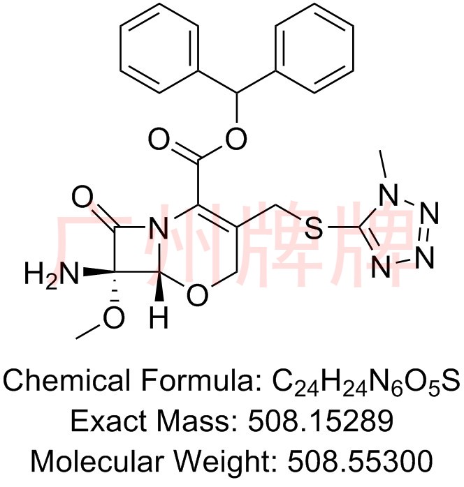CAS No:N/A||Chemical Formula:C24H24N6O5S||Molecular Weight:508.55300||Exact Mass:508.15289||benzhydryl (6R,7S)-7-amino-7-methoxy-3-(((1-methyl-1H-tetrazol-5-yl)……