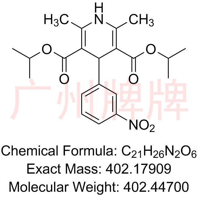 CAS No:21881-78-7||Chemical Formula:C21H26N2O6||Molecular Weight:402.44700||Exact Mass:402.17909||diisopropyl 2,6-dimethyl-4-(3-nitrophenyl)-1,4-dihydropyridine……