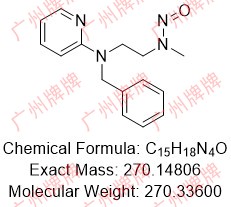 CAS NO:|Chemical Formula:C15H18N4O |Molecular Weight: 270.33600|Exact Mass:270.14806|N-(2-(benzyl(pyridin-2-yl)amino)ethyl)-N-methylnitrous amide