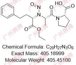 CAS NO:|Chemical Formula:C20H27N3O6 |Molecular Weight:405.45100 |Exact Mass:405.18999|N-((S)-1-ethoxy-1-oxo-4-phenylbutan-2-yl)-N-nitroso-L-alanyl-L-proline